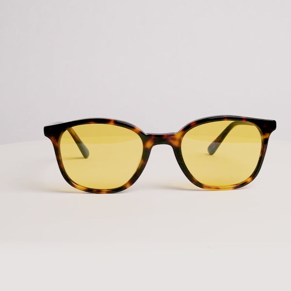Timeless round tortoiseshell frame with blue light blocking yellow lenses. Includes foldable hardshell case and microfiber lens cleaning cloth.
