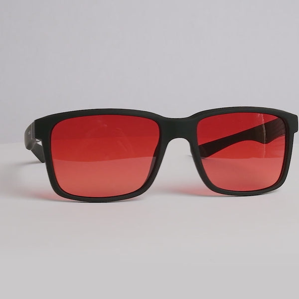 Classic square polycarbonate frame in matte black with red to yellow gradient blue light blocking lenses. Includes foldable hardshell case and microfiber lens cleaning cloth.