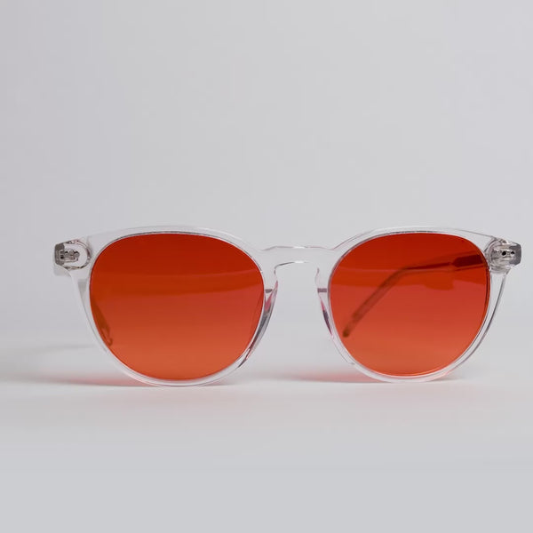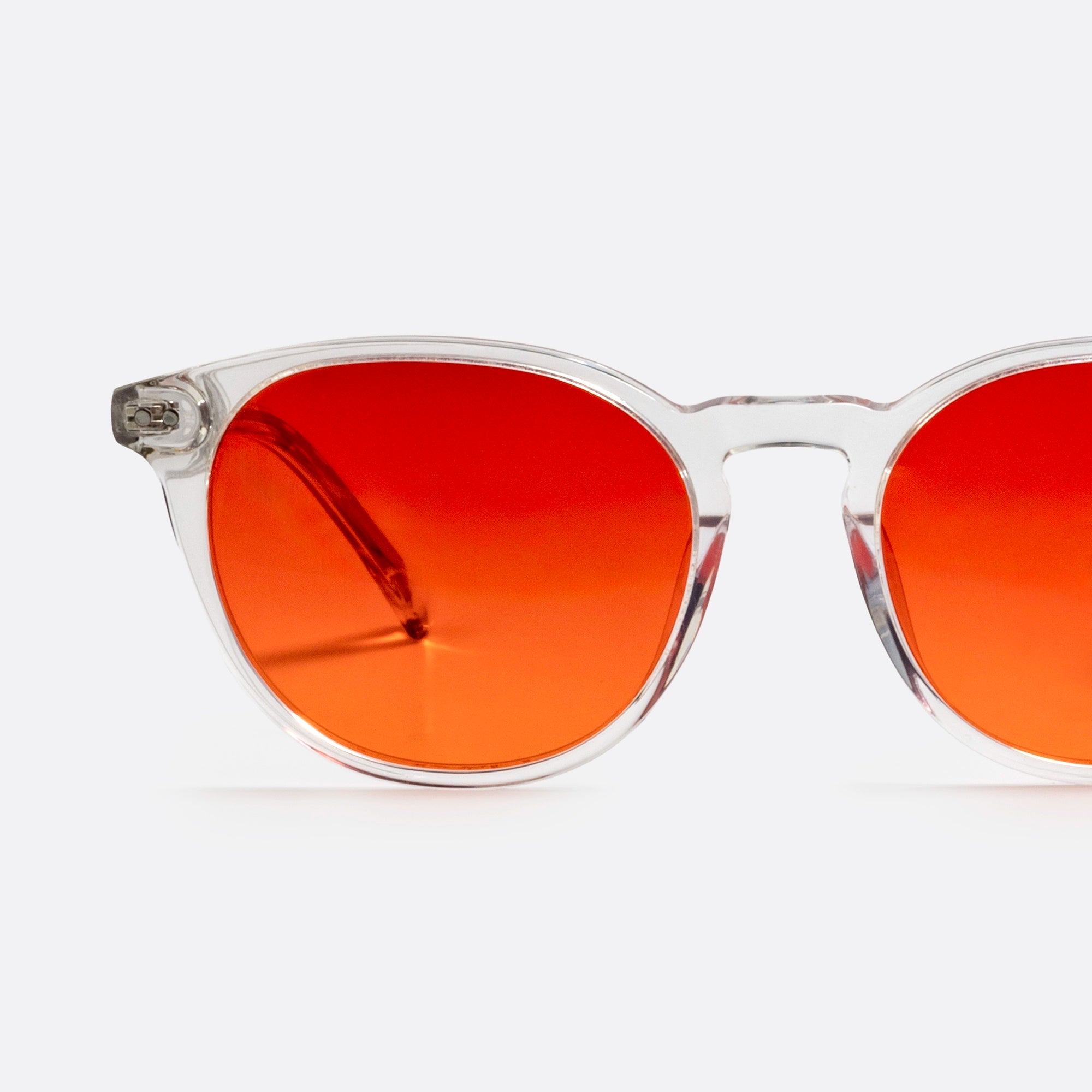 Sunsets use a gradient lens that blocks 99% of blue light and up to 93% of green light. The darker red top shields you from harsh overheads, while the lighter yellow bottom keeps vision clear for evening tasks.