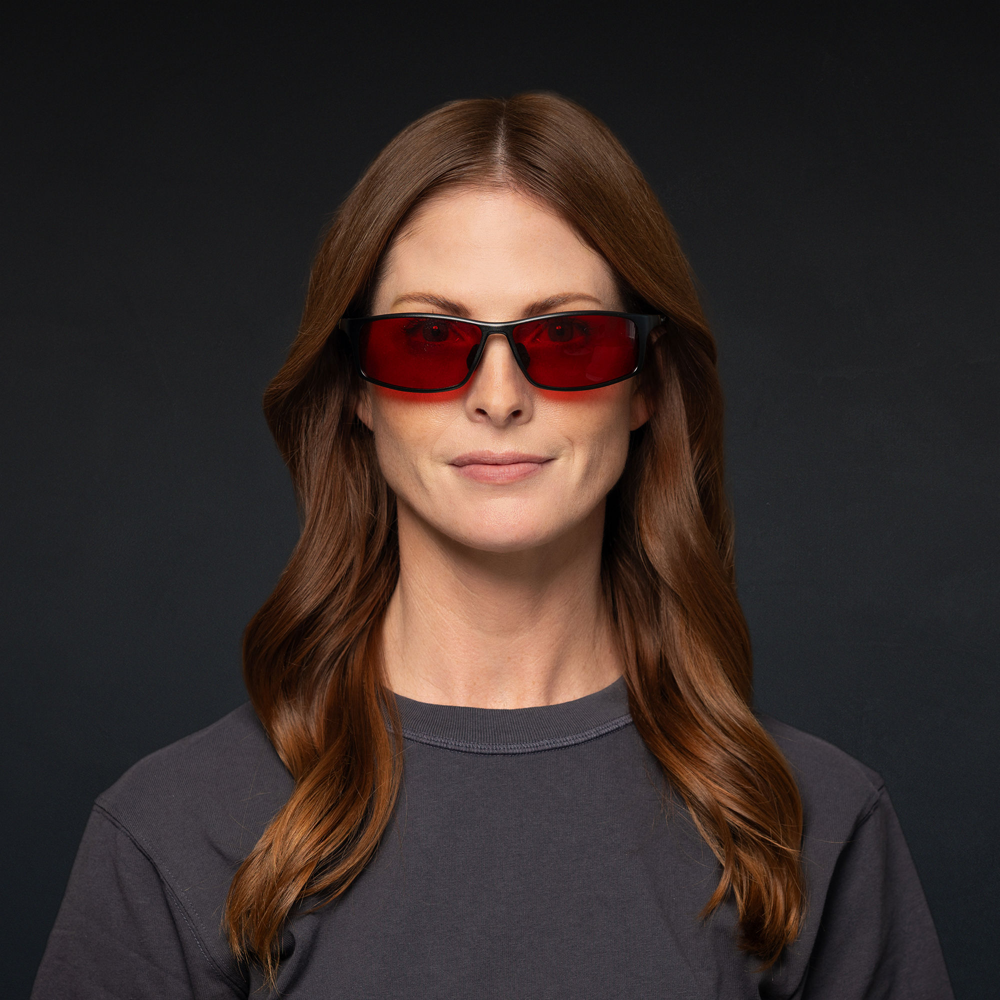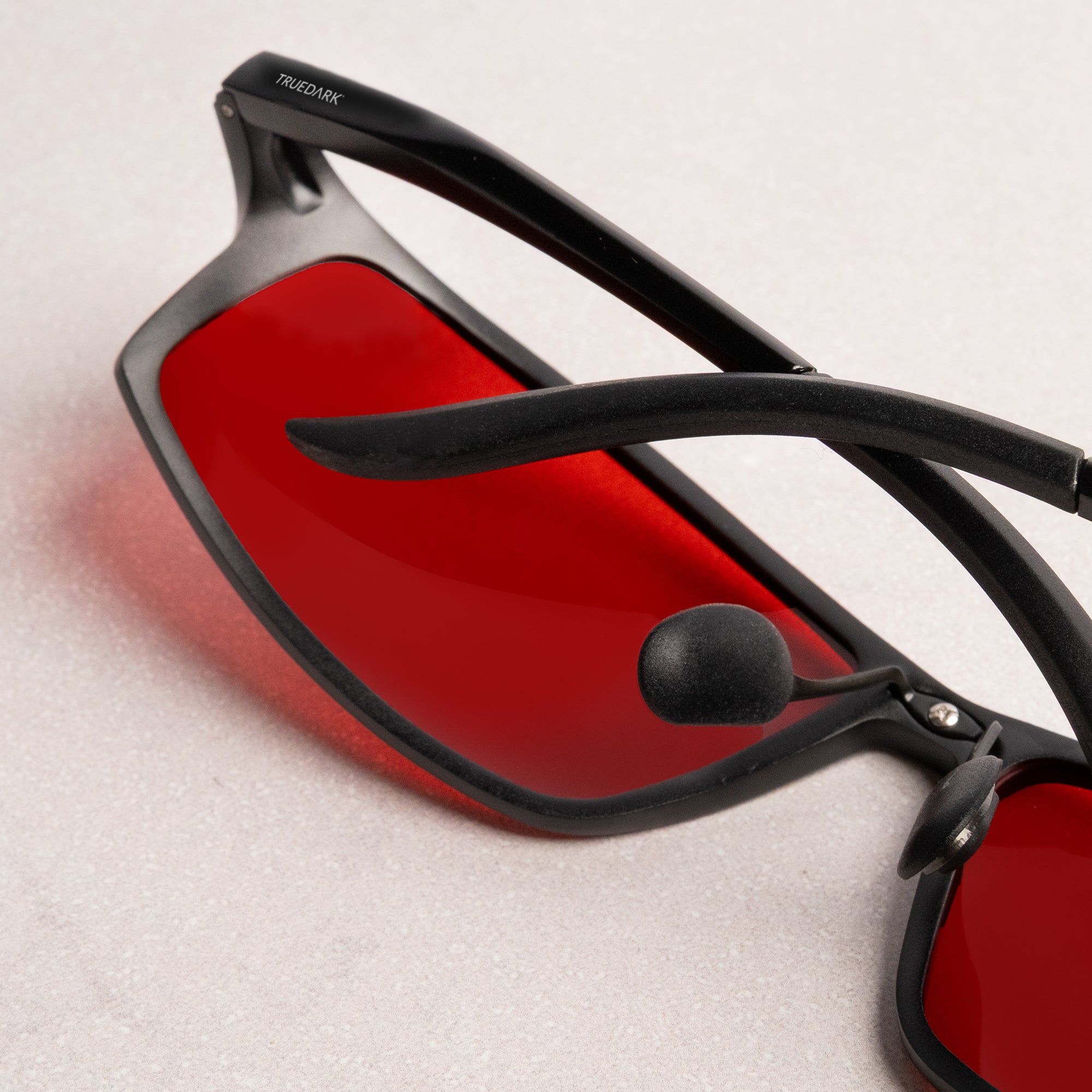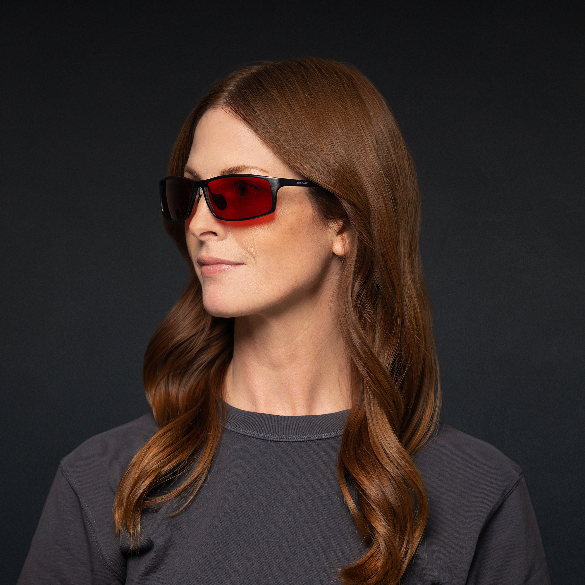 Red lens blocks 99% of blue, green, and violet light, plus 99% of UVA/UVB rays. Engineered to filter all junklight wavelengths that disrupt melatonin production and impact the sleep cycle.